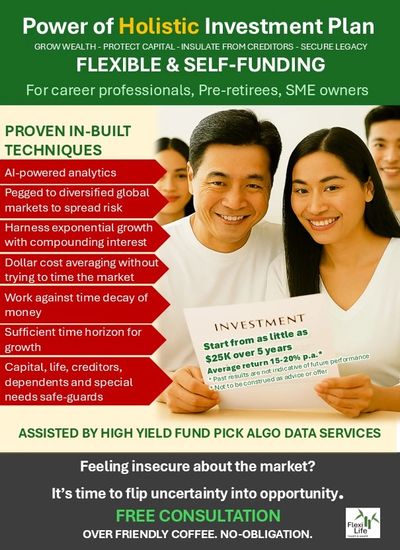 This plan allows you to enjoy compounding growth, protection from market volatility, and insulation against risks such as creditors and unexpected life events. It also provides the flexibility to adjust according to your goals, while ensuring capital and dependents are safeguarded. With potential returns of 15–20% p.a. (based on historical performance), it offers a balance between wealth creation and long-term protection.